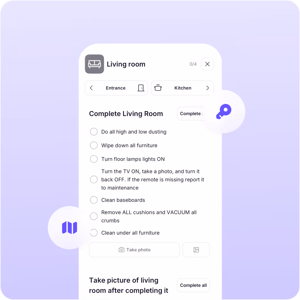 Room-by-room Task checklists with photos and short videos